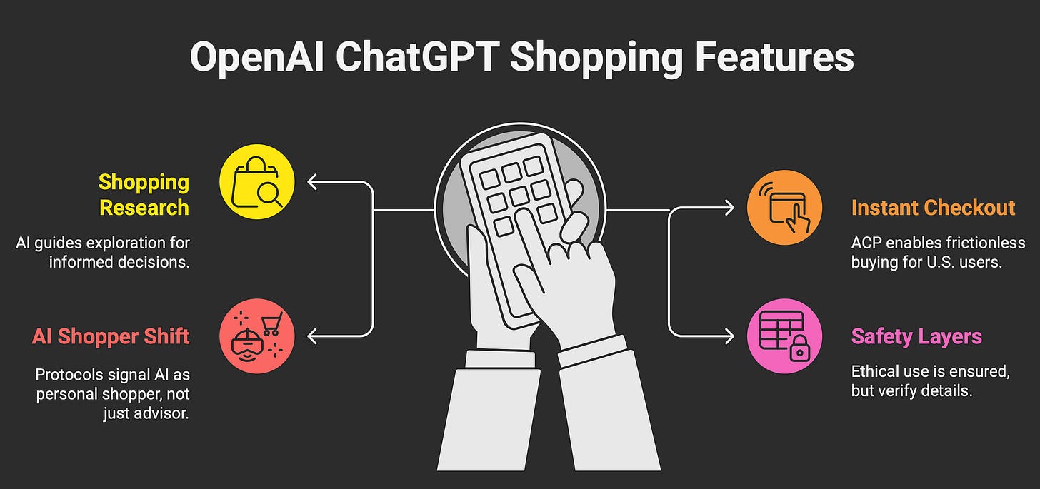 While Shopping Research focuses on research, Instant Checkout — launched September 2025 — handles the purchase.