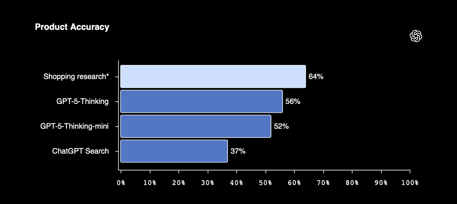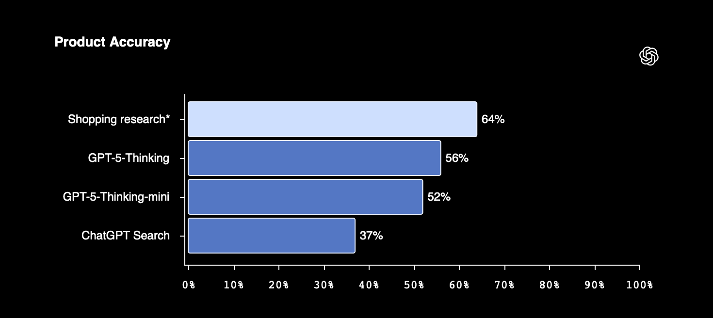 OpenAI evaluations show 52% product match on multi-constraint queries (e.g., price + colour + specs), rising to 64% in domain-specific tests — outperforming standard ChatGPT Search (37%).