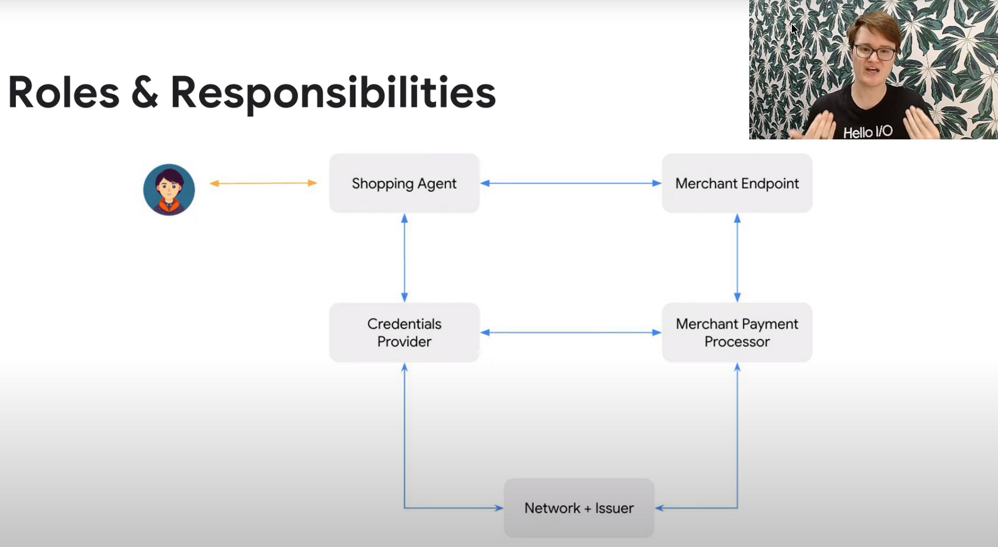 Agents (like ChatGPT) interact with merchants via REST/MCP APIs, sharing secure tokens for payments without exposing credentials.
