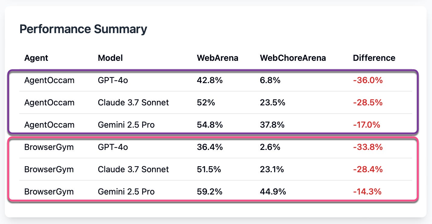 Consider the image below, in terms of accuracy, the easier benchmark (WebArena) scores in below 45%…WebChore which is more representative of more complex web interactions as we as humans have.