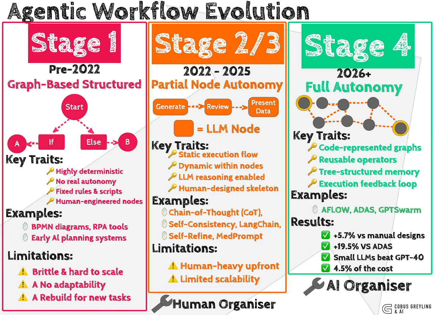 Advancing to Stage 3, agentic workflows emerged (we are here), blending human-crafted sequences (edges) with LLM-based lightweight AI Agent invocations (nodes).