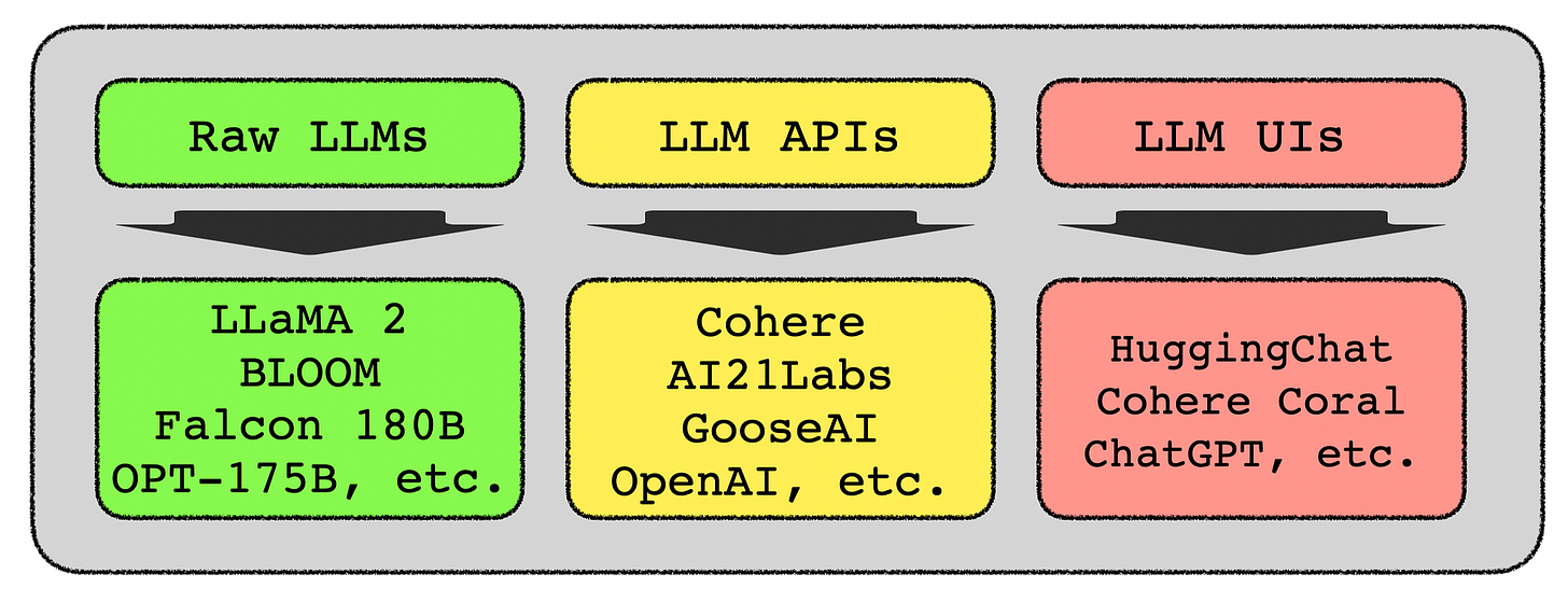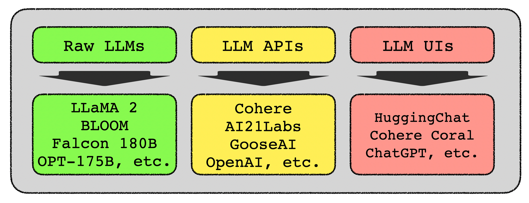In general, virtually no distinction is made between the raw LLMs, LLM APIs and end-user UIs like HuggingChat, Cohere Coral, ChatGPT and others.