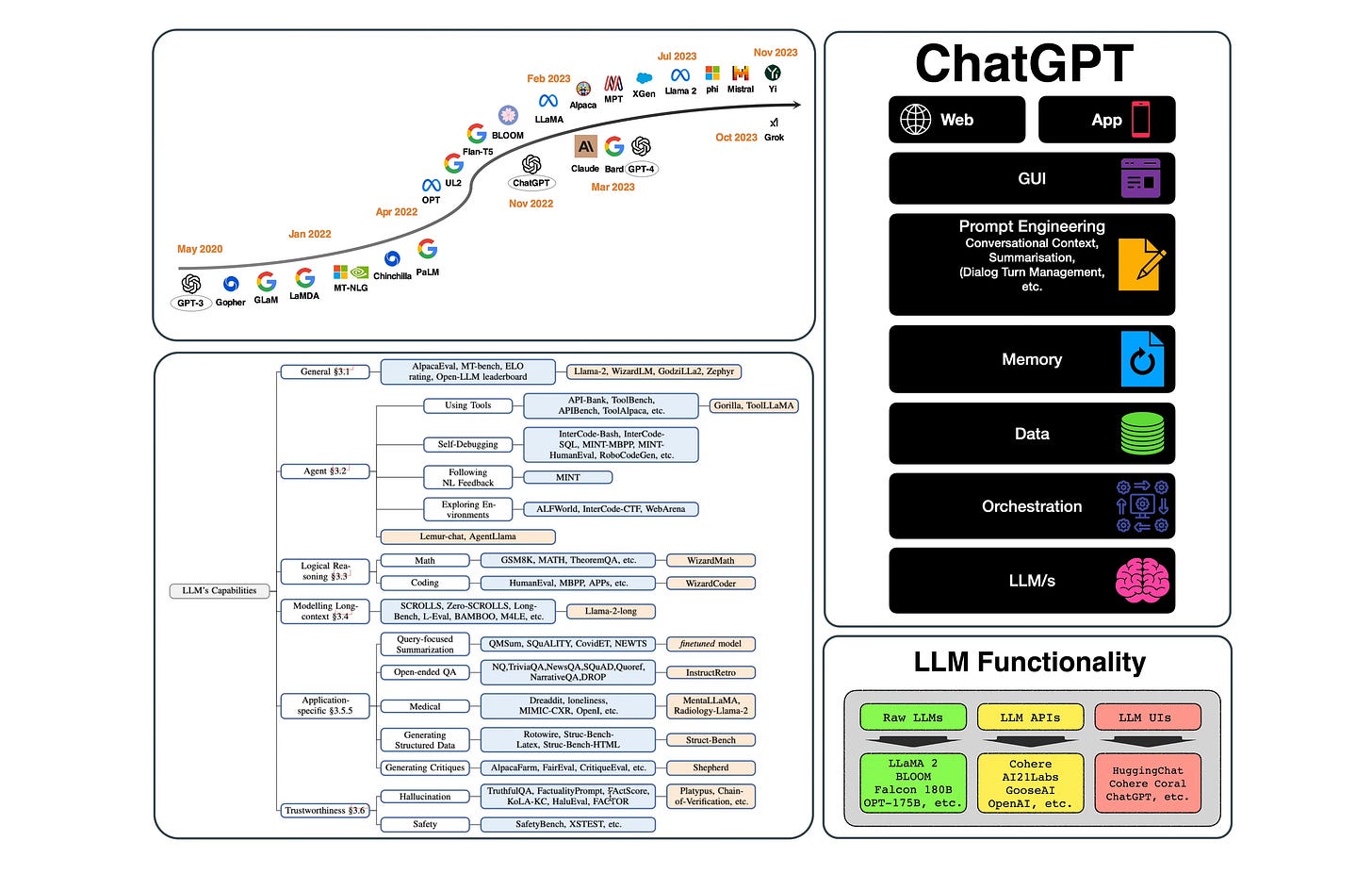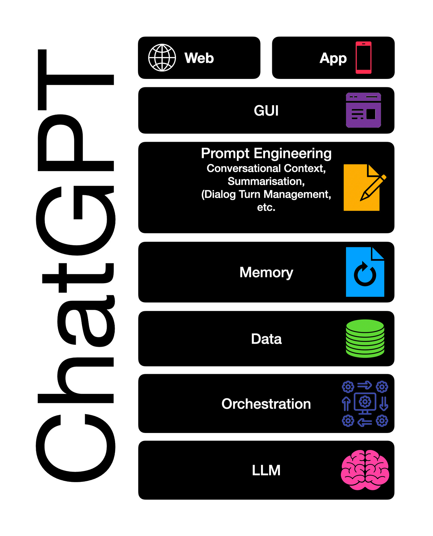 ChatGPT has democratised and popularised Large Language Models (LLMs), but ChatGPT is not a LLM per se. ChatGPT is a LLM-based User Interface, which delivers an exceptional user experience. The elements which (most probably) constitute ChatGPT are listed below.