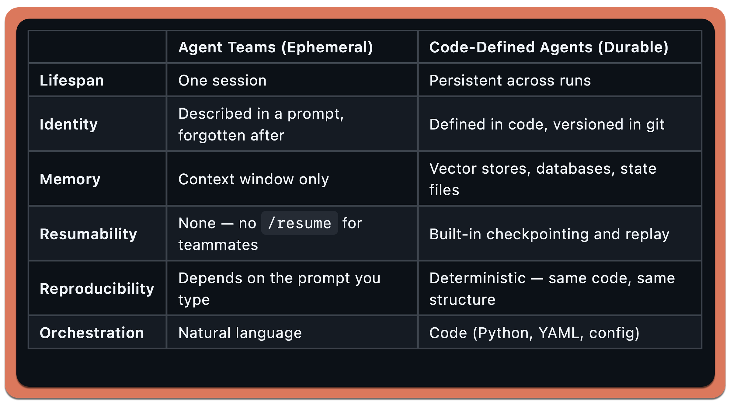 Agent Teams are ephemeral, code-defined agents are durable…in the traditional sense of software…
