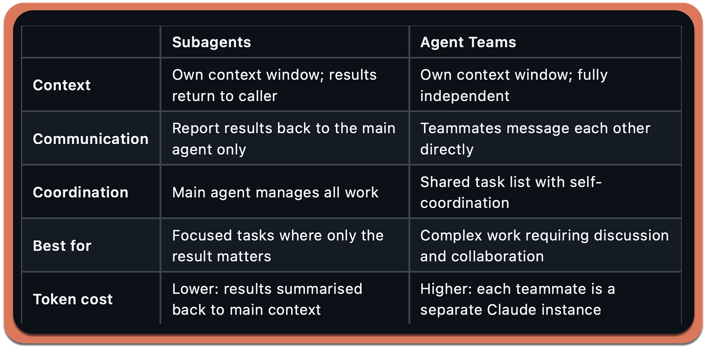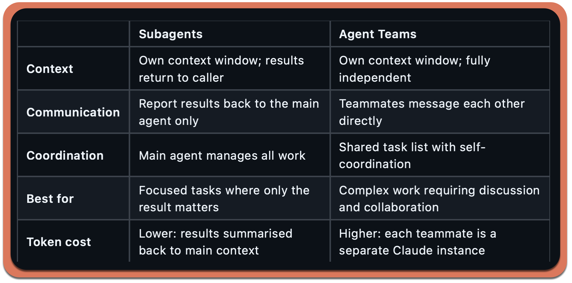 The distinction between subagents and Agent Teams is the key thing here. In practise I find subagents cover 90% of what I need -- context isolation for exploration or verification tasks that report back a summary. Agent Teams are brilliant when you genuinely need lateral coordination, like a frontend agent and a backend agent that need to keep an API contract in sync. But the token costs scale fast since each teammate is a full Claude instance with its own context window. I'd recommend starting with subagents and only reaching for Agent Teams when you hit that coordination bottleneck.