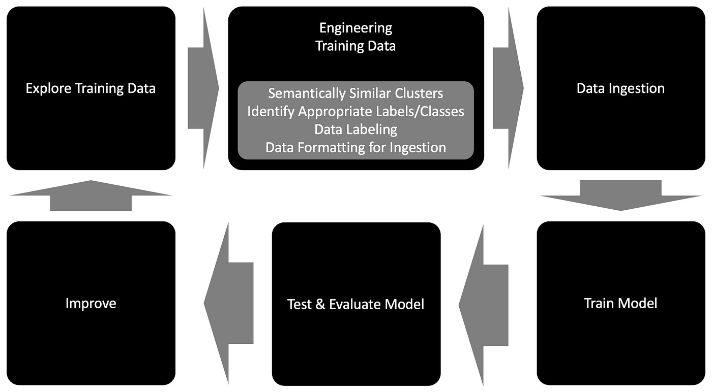 A data-centric approach to training data for AI, and in this case text classification, demands a continuous life-cycle as described in the image below.
