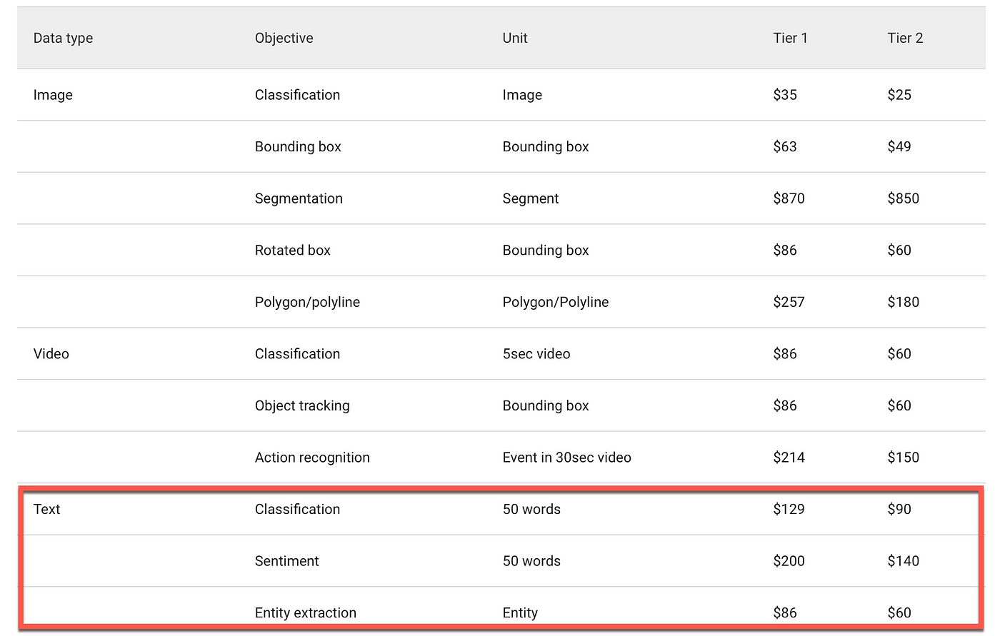 For a text classification task, units are determined by text length (every 50 words is a price unit) and the number of human labellers.