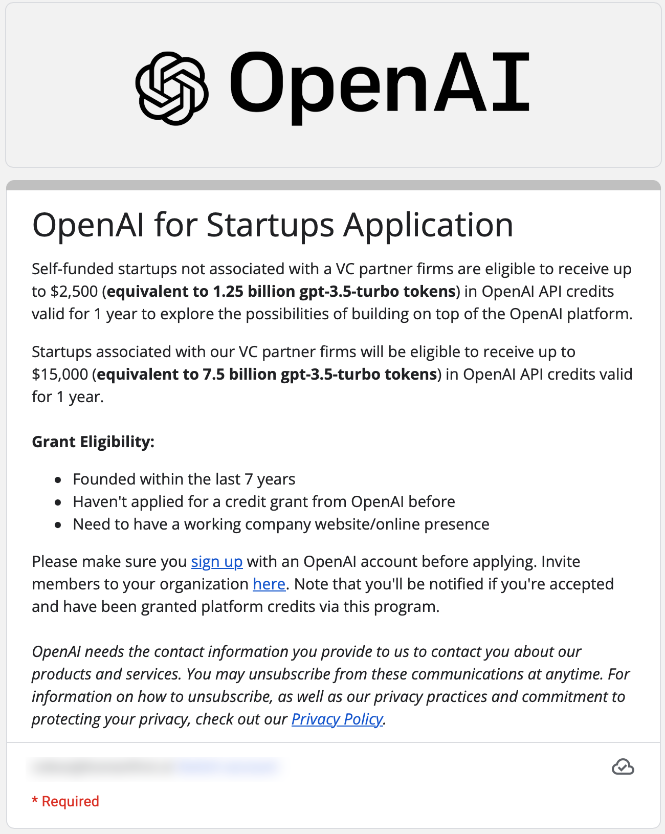 As seen below, OpenAI has announced that self-funded non-VC backed startups can apply for OpenAI API credits. And as I stated in the intro, the startup ecosystem is an important driver for innovation and product development.