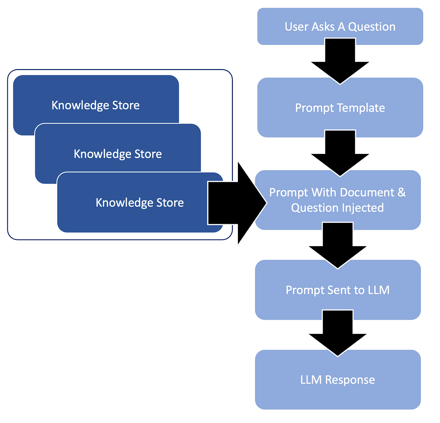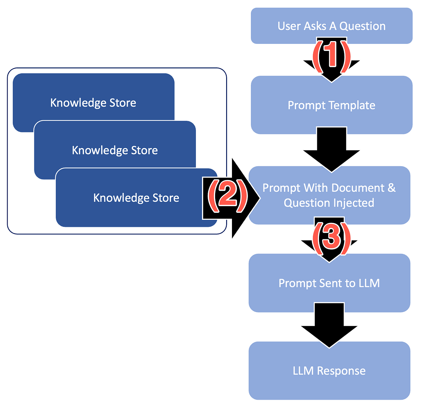 The variables or placeholders in the pre-defined prompt template are populated (also known as prompt injection) with the question from the user, and the knowledge to be searched from the knowledge store.