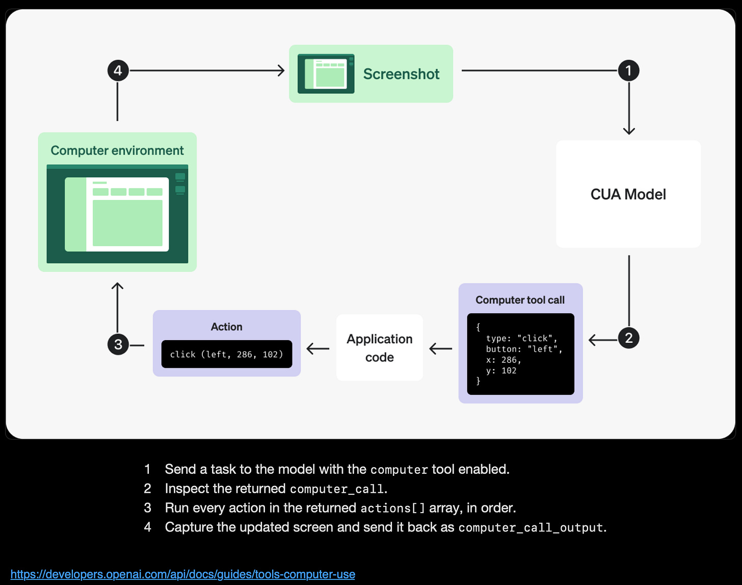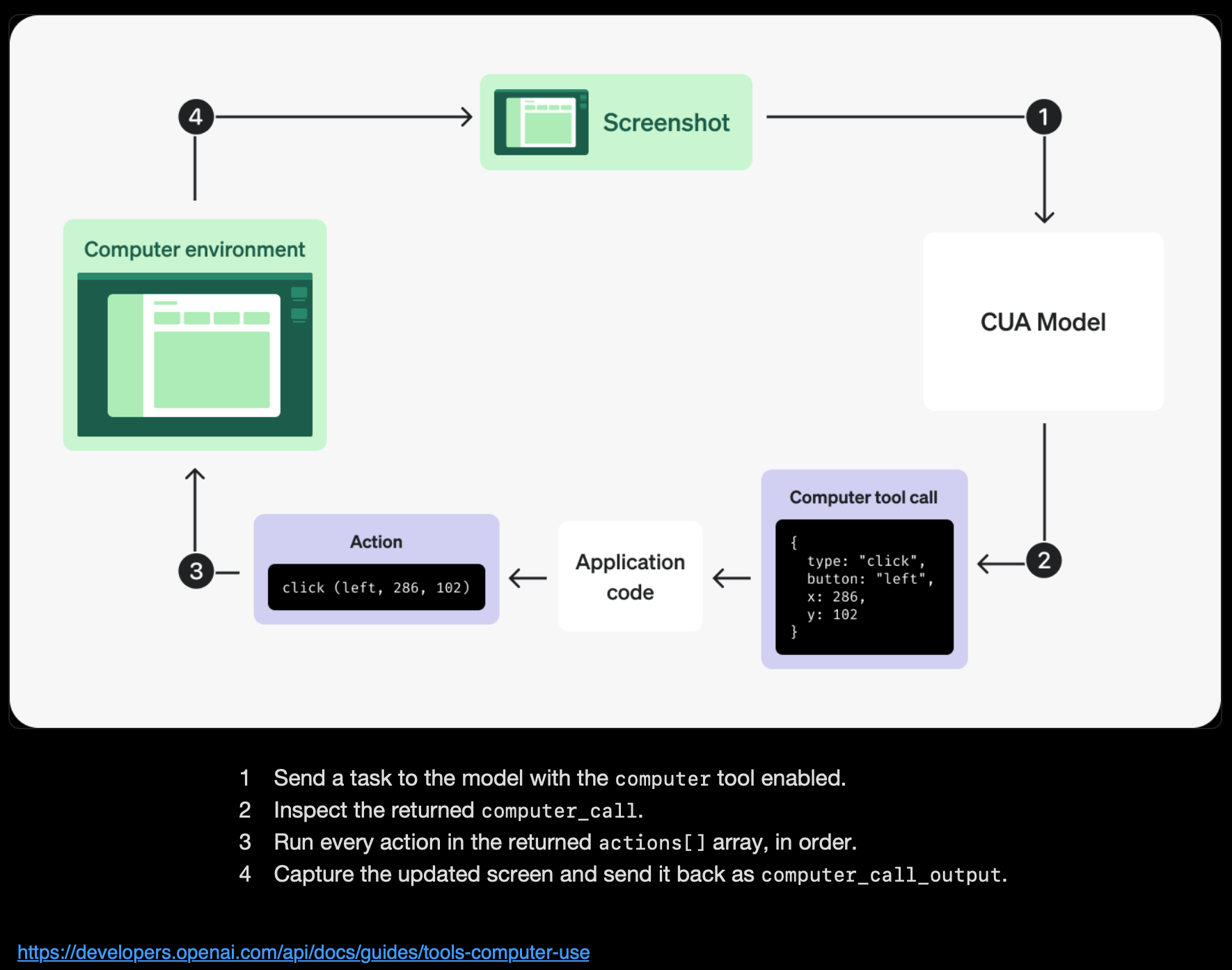 Use the Responses API computer tool to click, type, scroll, and inspect screenshots.developers.openai.com