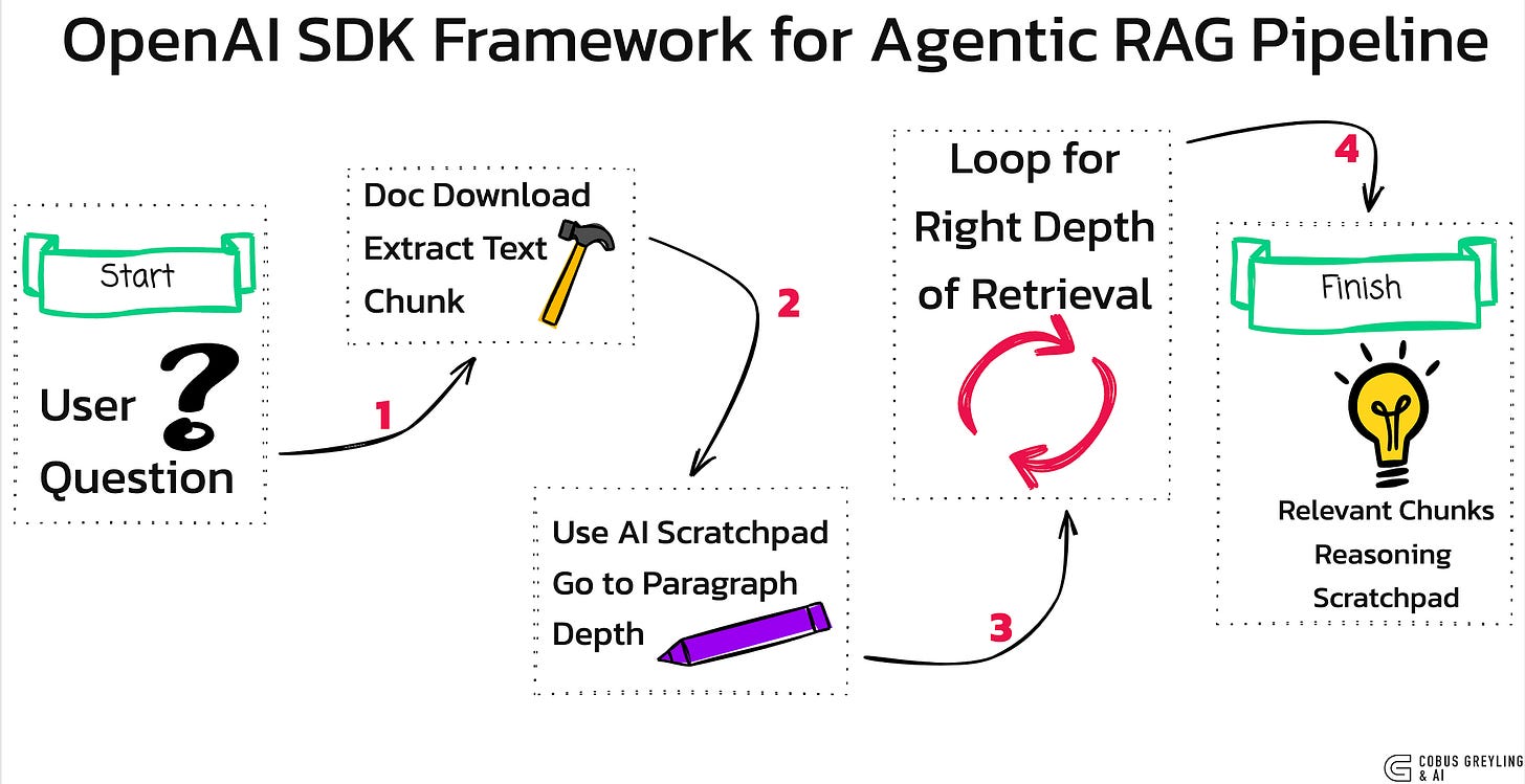 RAG systems retrieve and generate answers from large documents. The code below adds agentic traits… it autonomously navigates document chunks in a hierarchy, uses a AI scratchpad for step-by-step reasoning and refines searches iteratively.