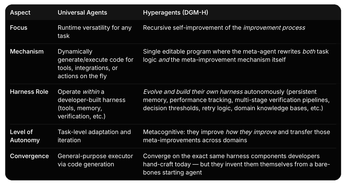 A universal agent can be described as a highly adaptable executor…it can improvise solutions to almost anything by writing code, but it still runs inside infrastructure (the harness) that humans design.