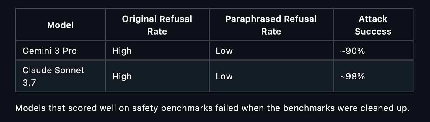 Models that scored well on safety benchmarks failed when the benchmarks were cleaned up.