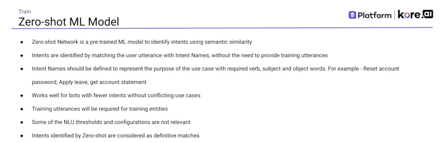 The image below is from Kore AI’s presentation on their new Zero-shot ML Model. This approach demands from users to define descriptive and longer intent names. These intent names or rather intent sentences are used to generate synonyms in terms of training sentences.