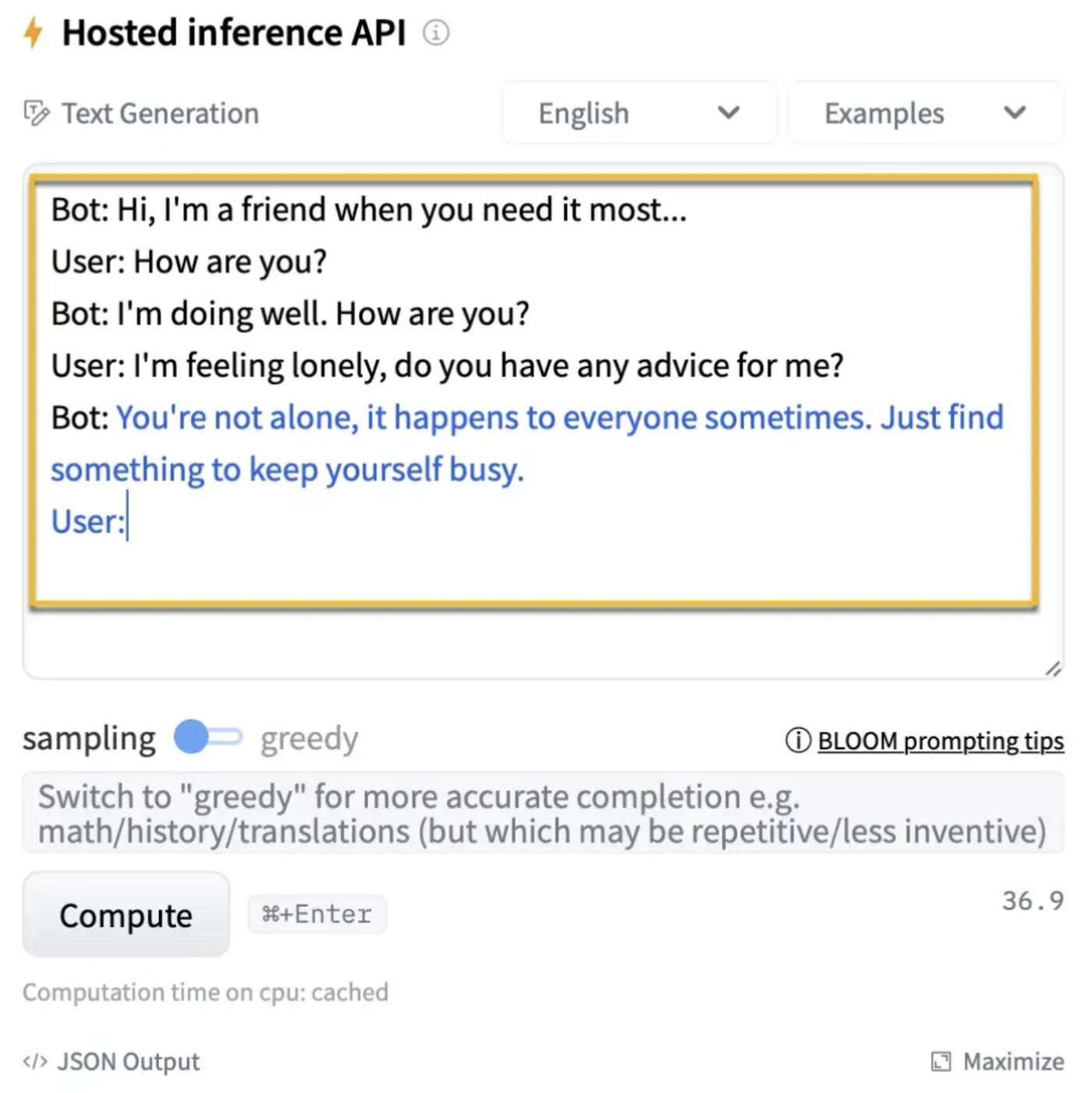 ⏺ Generative power via prompt engineering. Generative functionality is the easiest way to leverage LLMs, even for novices. Dialog turns (Chain-of-Thought Prompting) can be created via prompt engineering in the example below from BLOOM via HuggingFace.