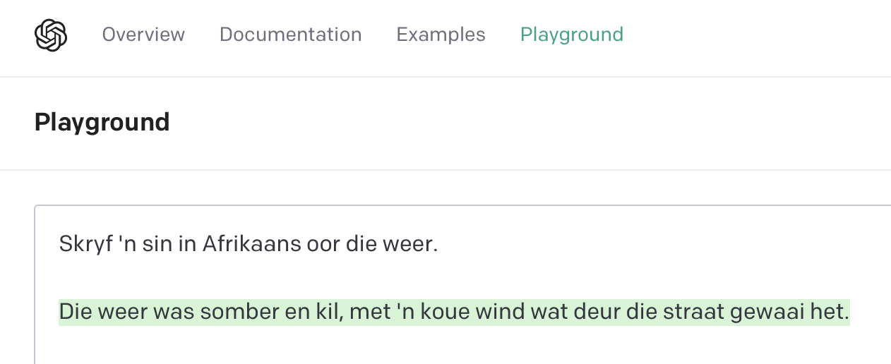 ⏺ Human language translation/ Multilingual. LLMs has the ability to be multilingual and translate between different languages. In the example below from OpenAI’s Language API referencing the text-davinci-003 model, perfect Afrikaans is understood and generated.