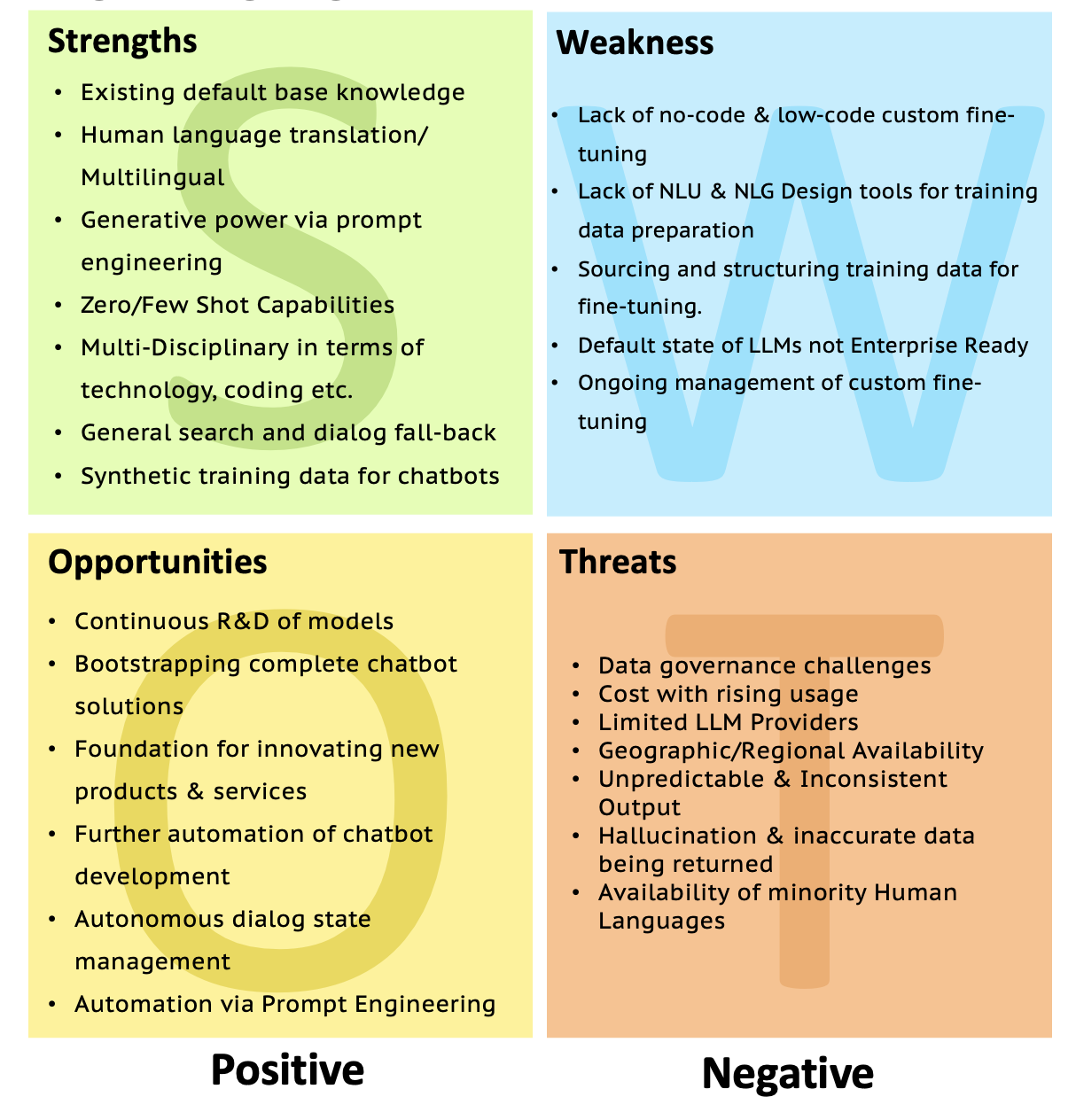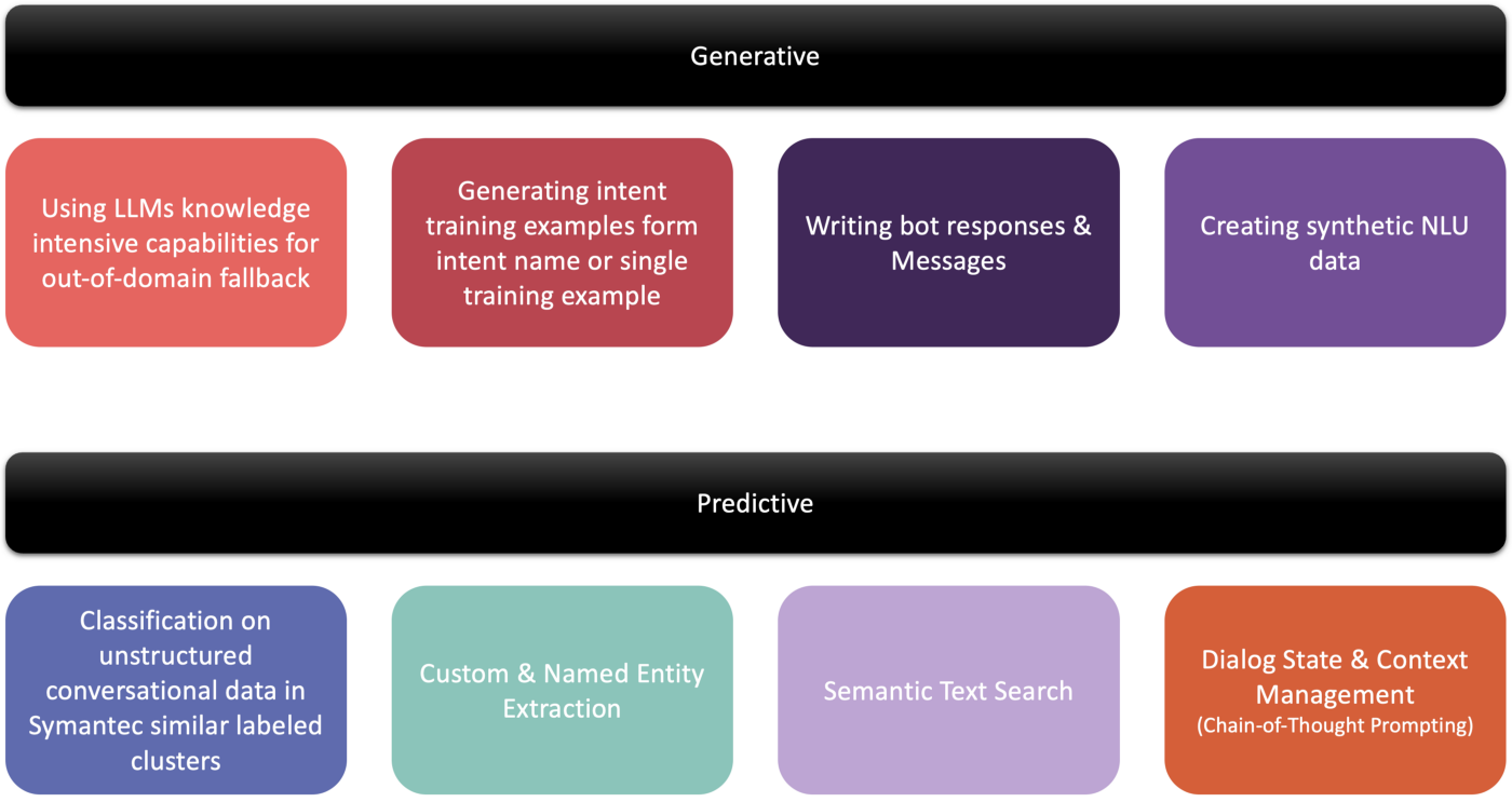 ⏺ Further automation of chatbot development. Currently LLM activity in chatbot development frameworks is limited to intent training data and general fallback. As LLMs develop, there should be other automation opportunities for chatbot development and management.