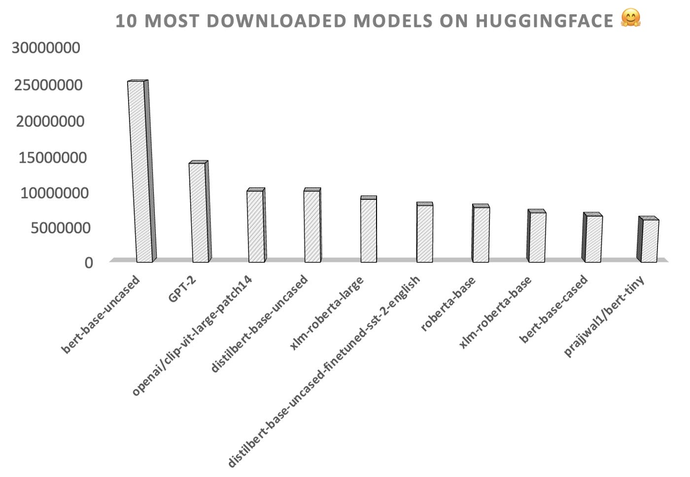 In the graph below are the top 10 most downloaded models on HuggingFace. It is clear that natural language processing makes up a big chunk of this. It would be interesting to know to what extend these models are already leveraged under the hood within chatbot development frameworks.
