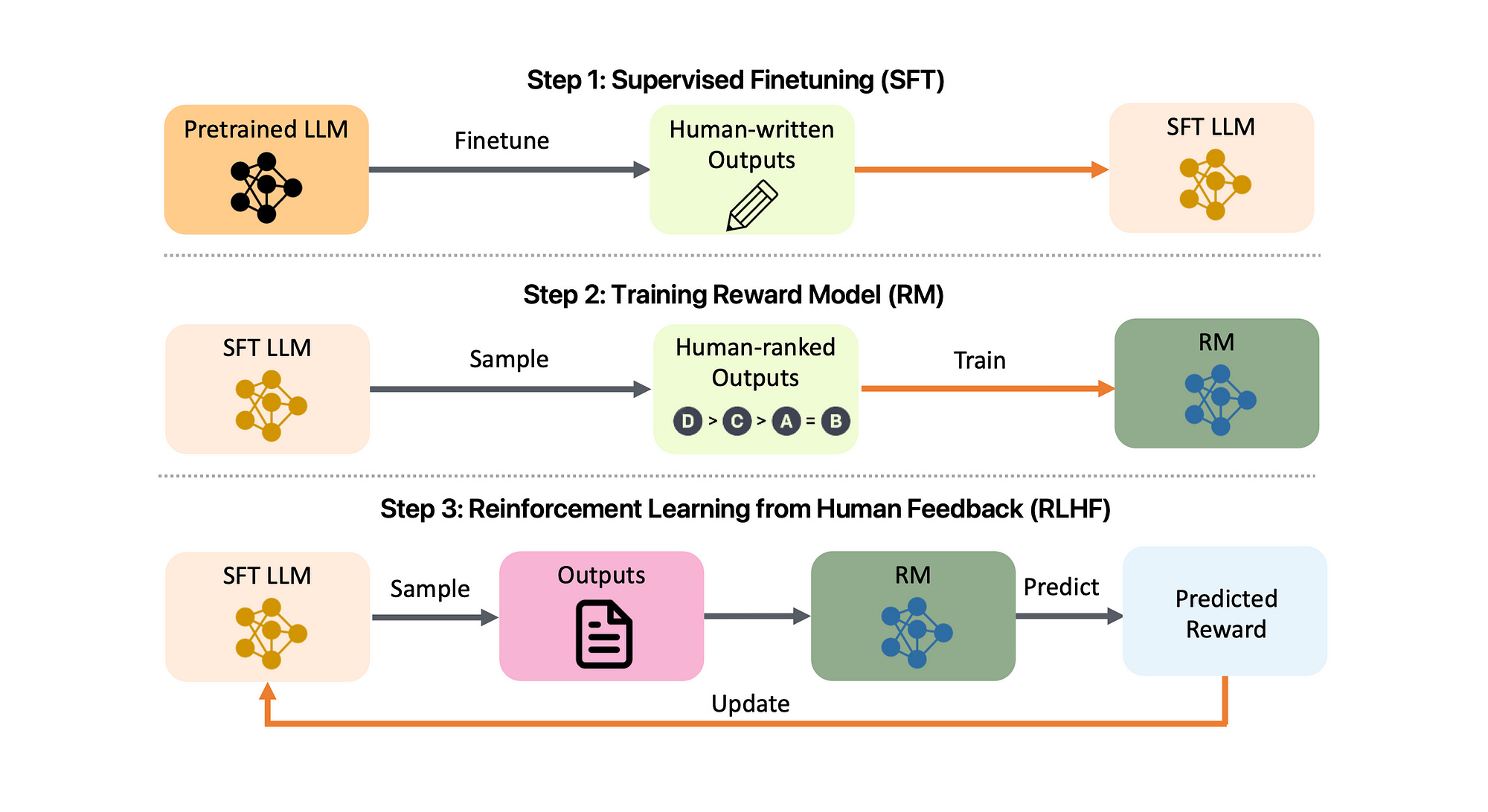Step 3 — Reinforcement Learning from Human Feedback (RLHF): Given a prompt, we sample output from the SFT LLM. Then we use the trained reward model to predict the reward on the output. We then use the Reinforcement Learning (RL) algorithm to update the SFT LLM with the predicted reward.