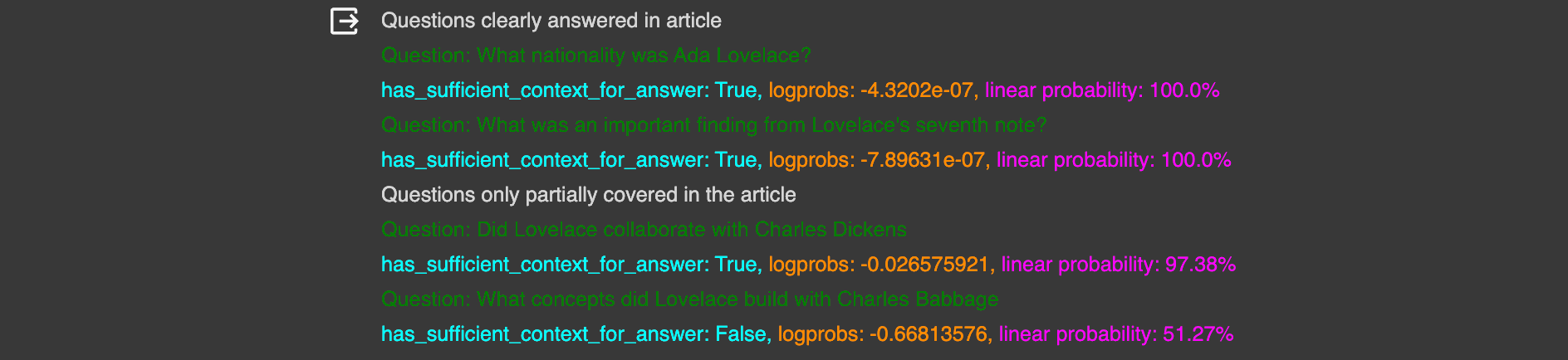 html_output += f'<p style="color:cyan">has_sufficient_context_for_answer: {logprob.token}, <span style="color:darkorange">logprobs: {logprob.logprob}, <span style="color:magenta">linear probability: {np.round(np.exp(logprob.logprob)*100,2)}%</span></p>'