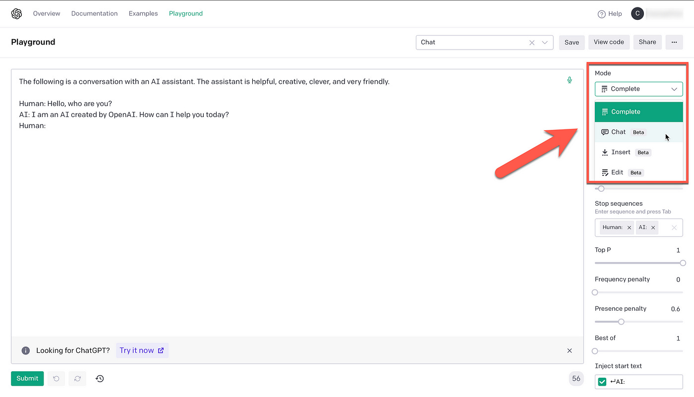 Below is a screenshot of the complete OpenAI playground, with the modes visible at the top right.