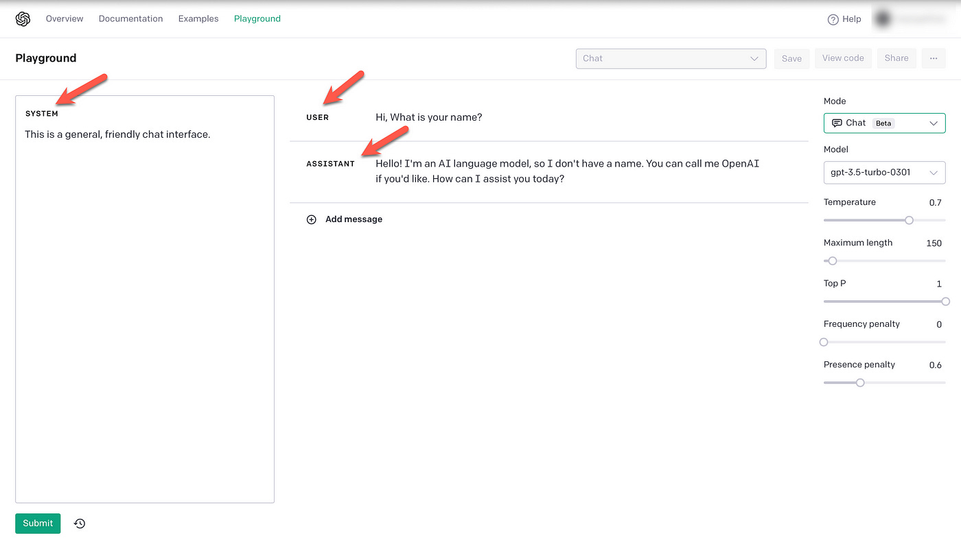 And the same view in the code, notice how system, user and assistant roles are defined: