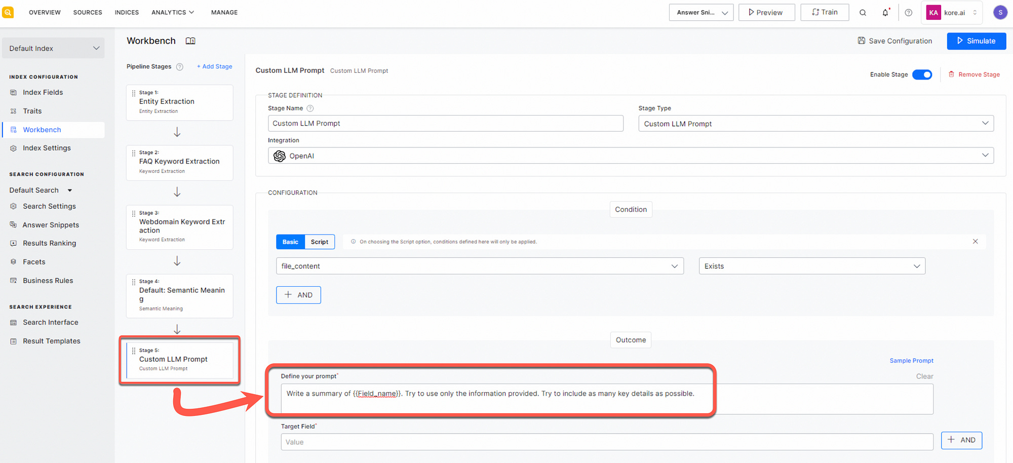 Key elements along the prompt pipeline can include Keyword Extraction to automatically detect important words from the text stored in a field.