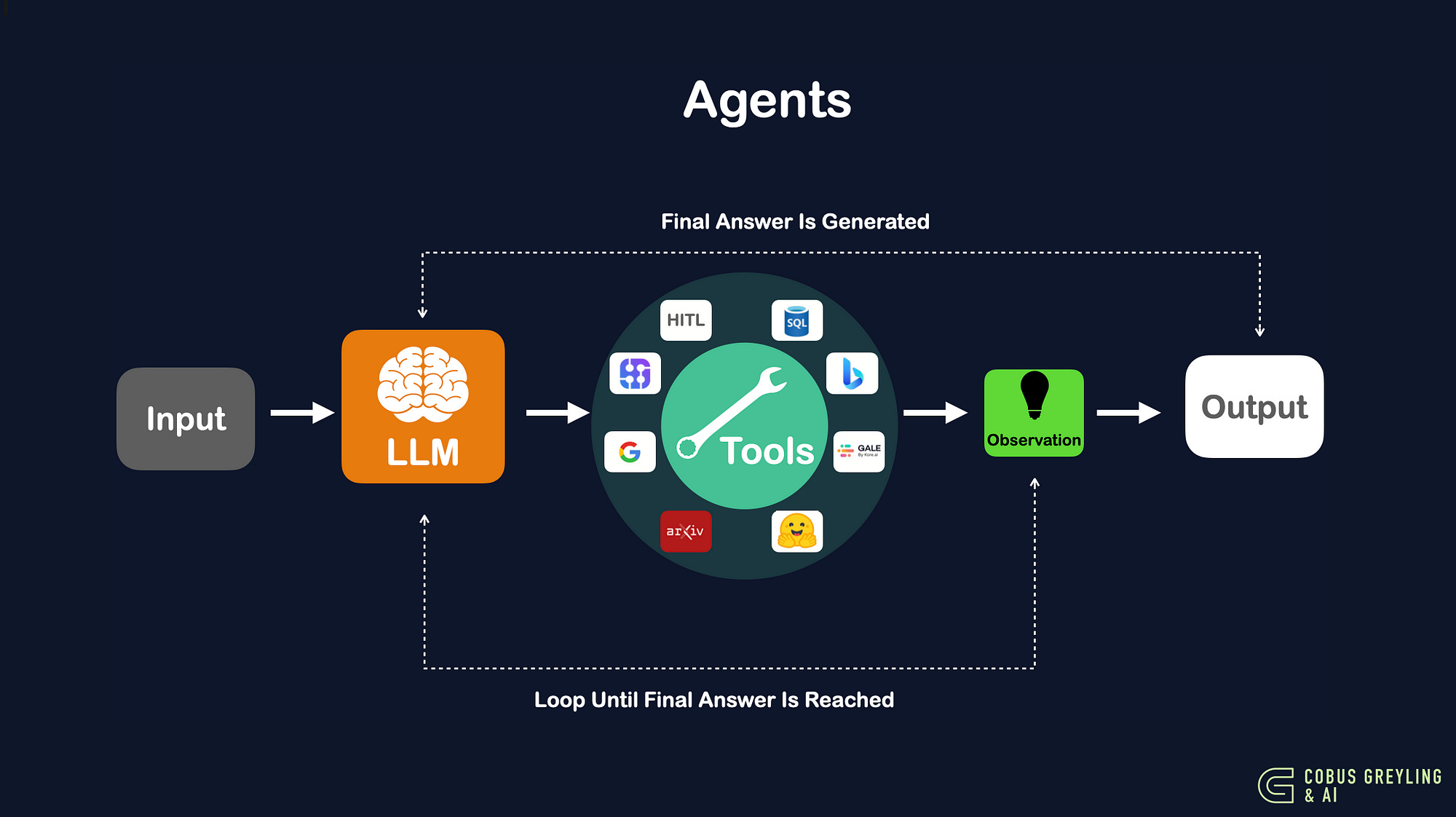A key function of AI Agents is their ability to instruct Language Models how to use tools and interact with other agents or external systems like the internet.