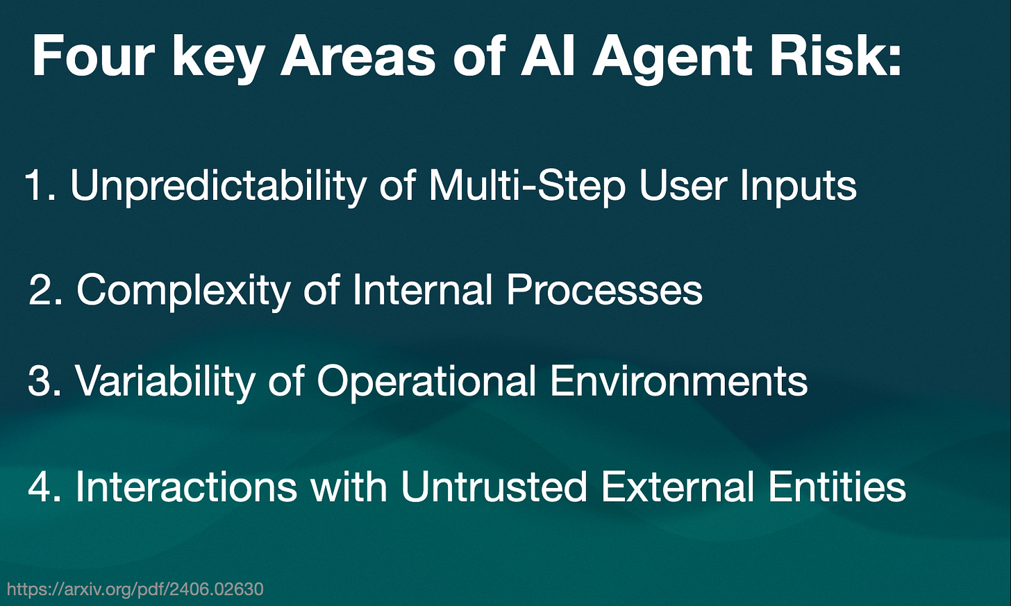 A recent survey investigated the emerging security threats confronting AI Agents, and categorising these threats into four key areas: the unpredictability of multi-step user inputs, the complexity of internal processes, the variability of operational environments together with interactions with untrusted external entities.