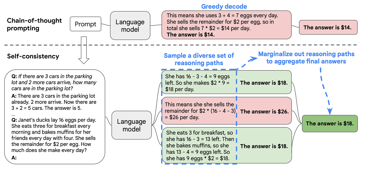 As seen above, the three steps involved in Self-Consistency Prompting;