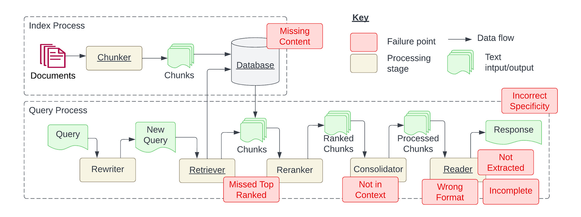 Failure can occur while posing a question that cannot be addressed using the existing documents. In the favourable scenario, the RAG system will simply reply with a message such as “Sorry, I don’t know.” However, in cases where questions are relevant to the content but lack specific answers, the system might be misled into providing a response.