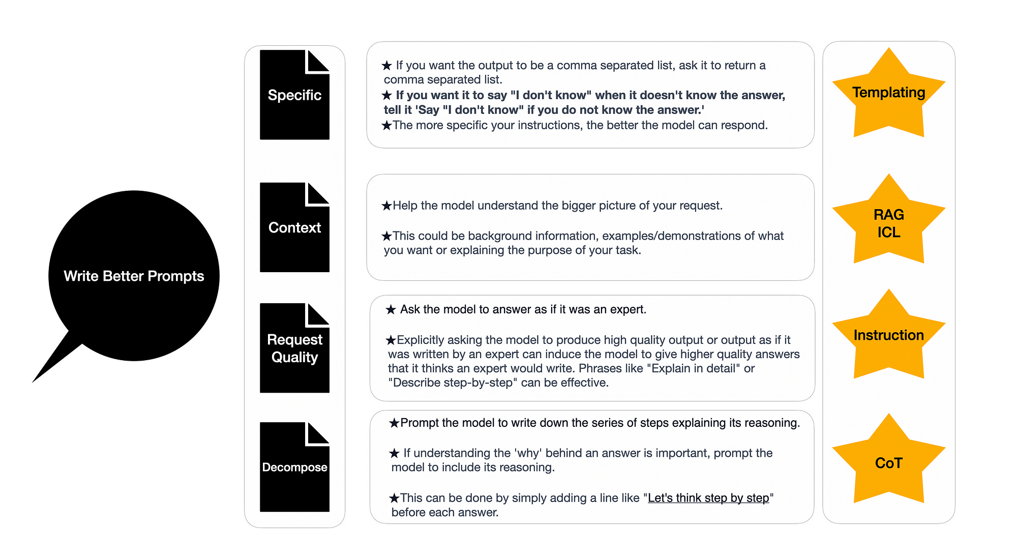 The image below lends some guidance on how LLMs can be guided via prompt engineering to yield better responses. Some prompting techniques require the introduction of complexity and structure to be implemented.