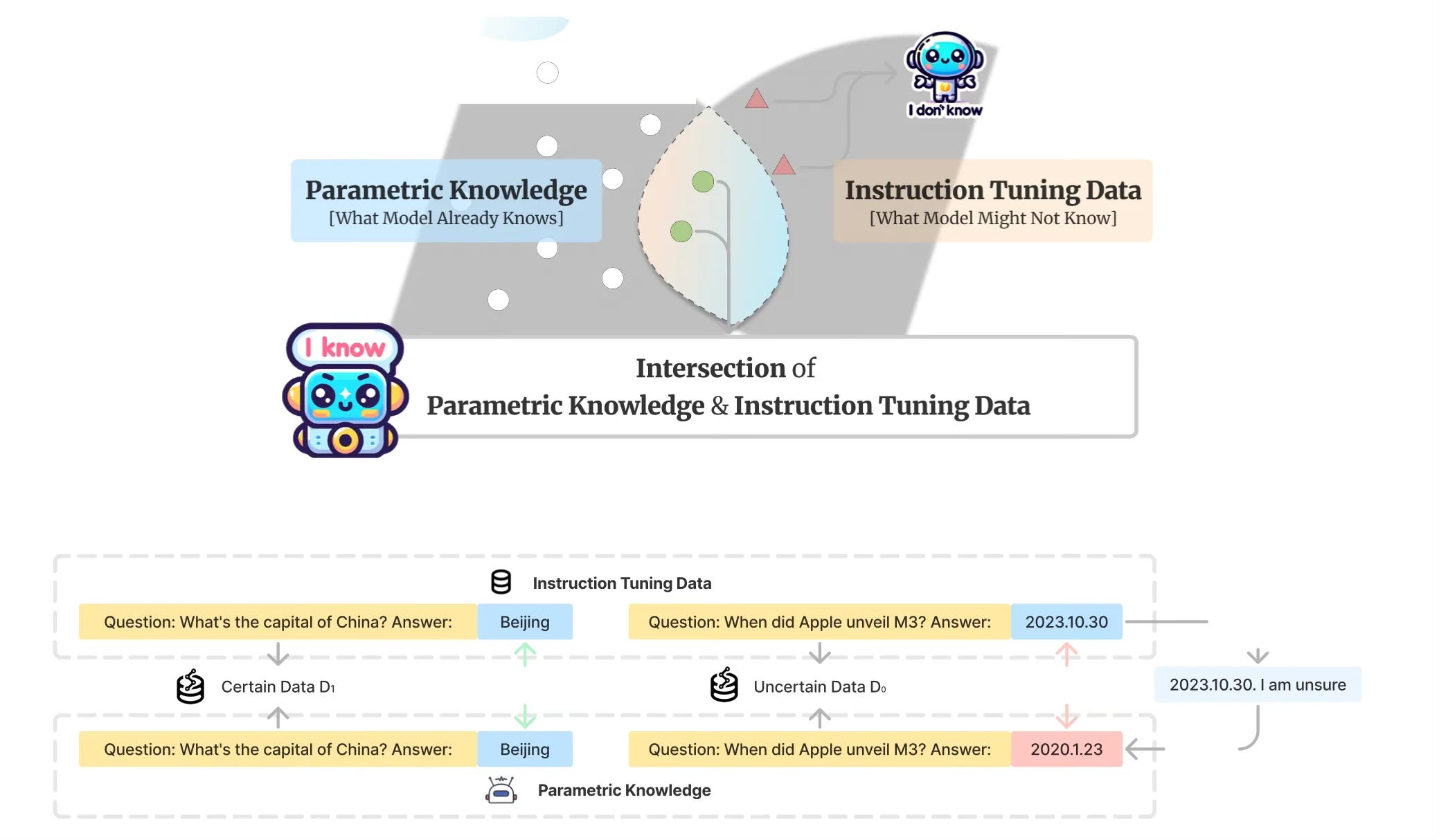 R-Tuning identifies discrepancies between instruction tuning data and the model’s knowledge, dividing the training data into certain and uncertain parts.