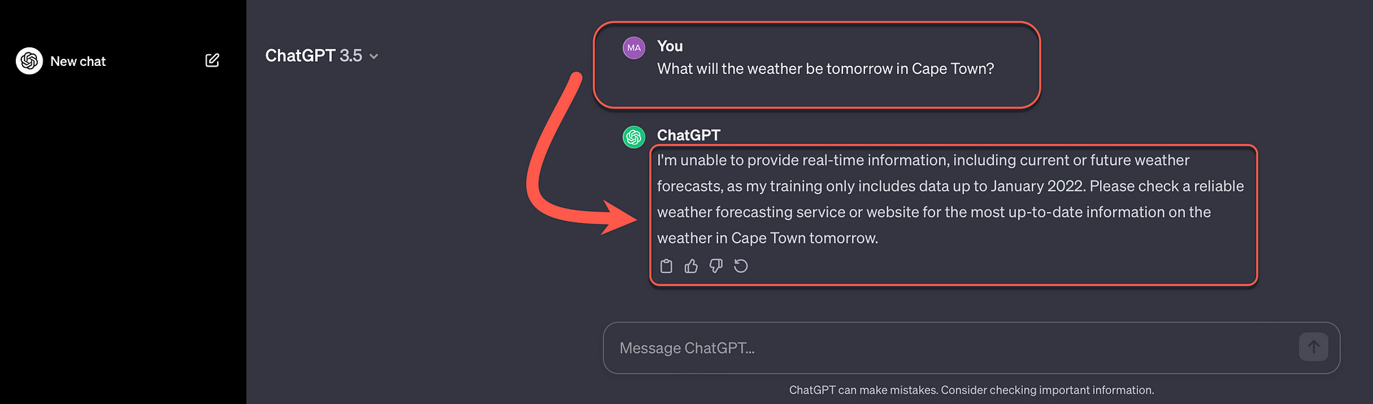 Consider the response below from ChatGPT where a question is asked about the weather which is highly contextual demanding recent information.