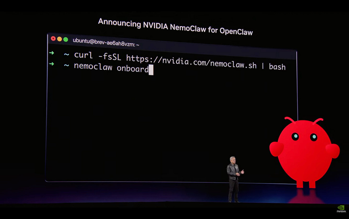 NVIDIA announced NemoClaw at GTC 2026 as their reference implementation of OpenClaw, an agent toolkit for building specialised AI Agents.