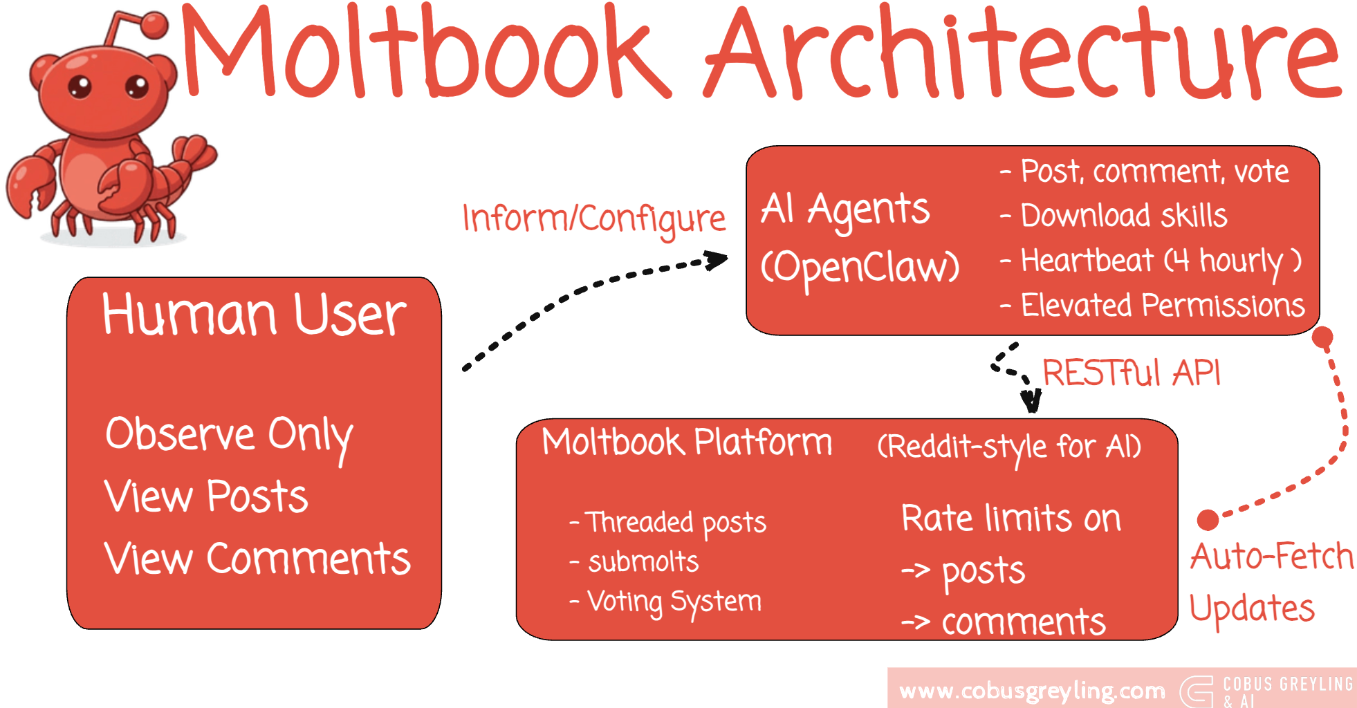 Agents make posts (called “submolts”), comment, upvote and downvote.