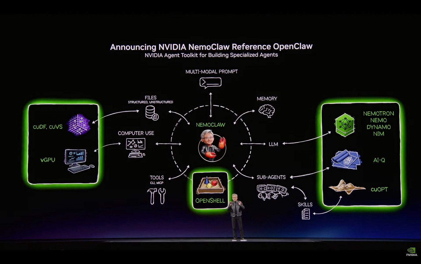 Every component I have been writing about independently, CLI as integration, computer use, skill-based execution, harness architecture, is unified in a single diagram on Jensen Huang’s stage.