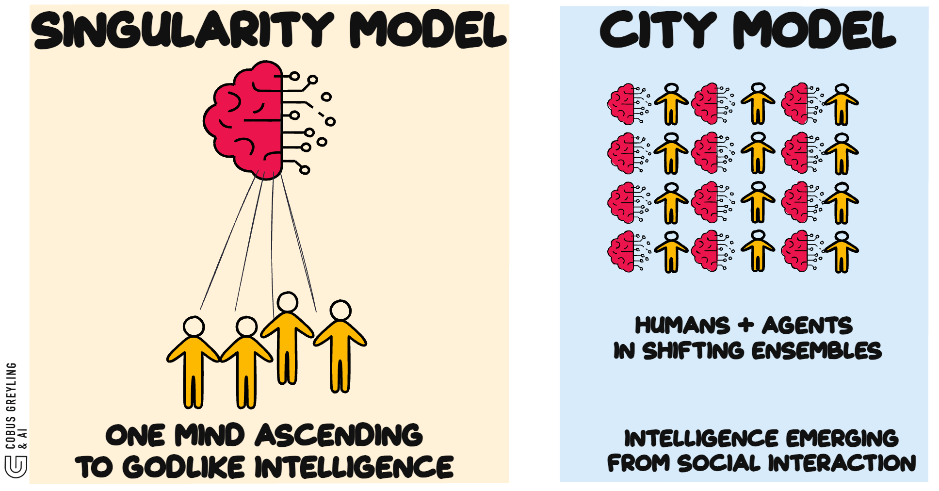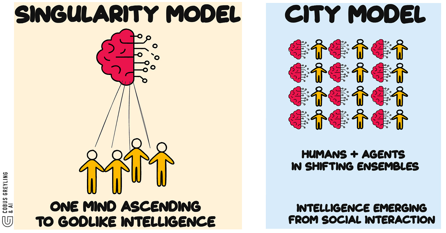 Intelligence grows like a city, not like a single meta-mind.