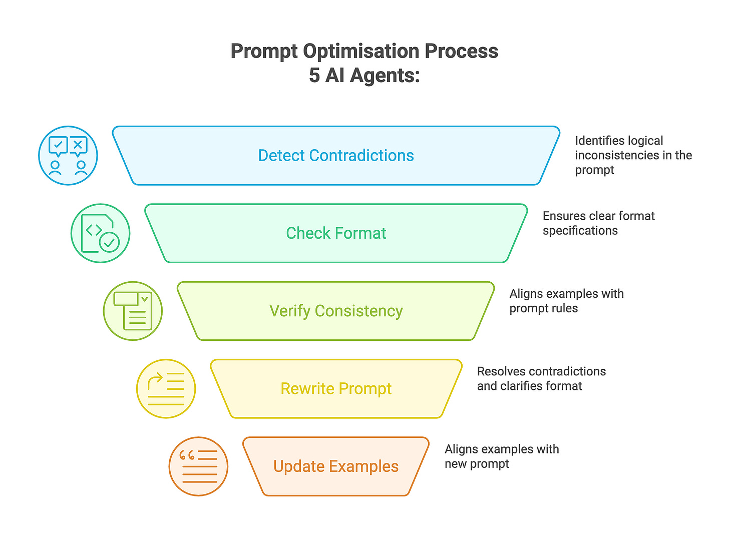 The prompt optimisation system uses a collaborative multi-AI Agent approach to analyse and improve prompts.