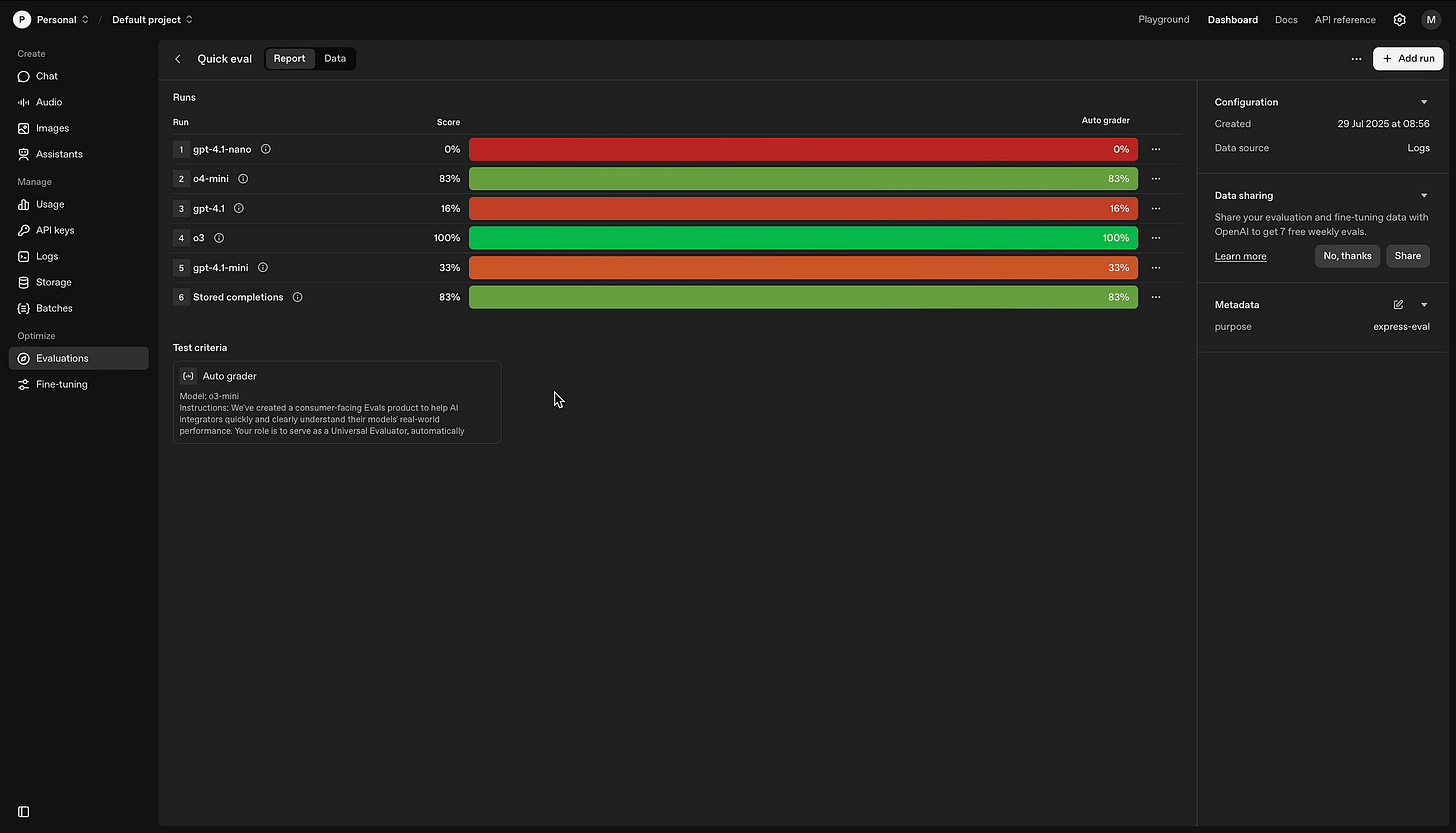 Through evaluation with a Python string check grader, the project tunes AI Agent instructions and selects the optimal model (for example o3