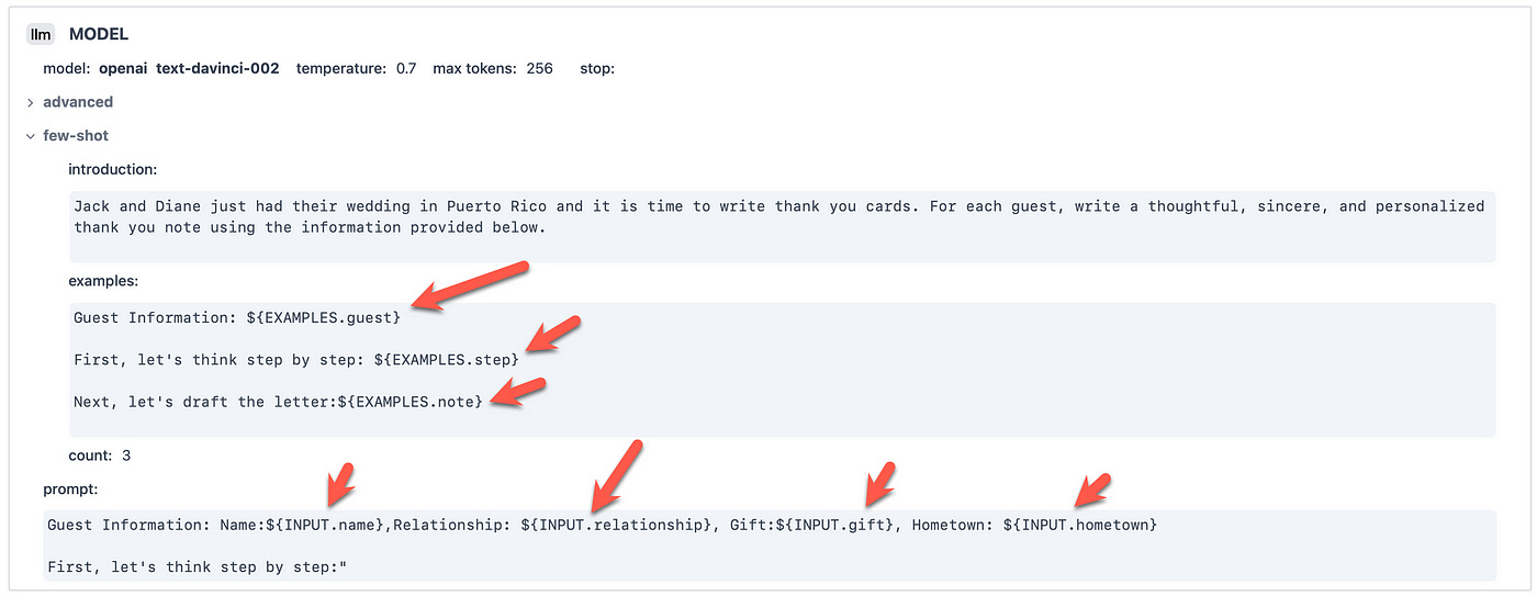 The screenshot below is from the DUST interface which can be used to build LLM applications. The example below is a wedding thank you note generator.