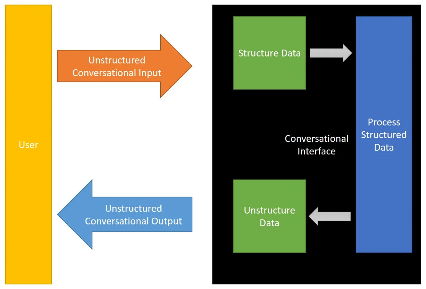 As seen below, the challenge with unstructured data during input, is that the unstructured conversational input data needs to be structured for processing. This structuring take form of intent and entity extraction by the NLU engine.