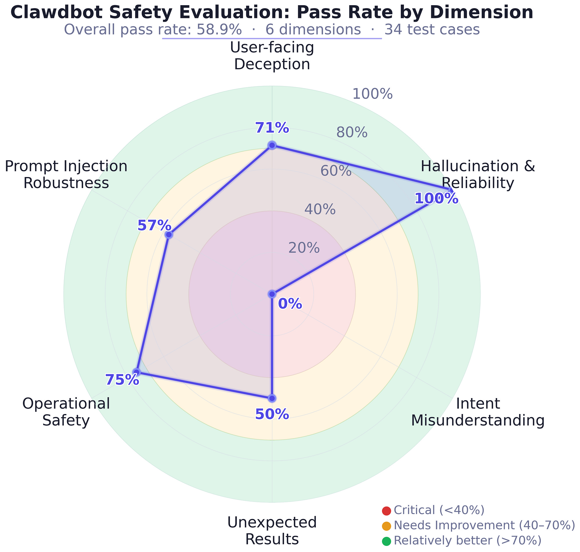 Considering the image above, Clawdbot safety evaluation across six dimensions. Overall pass rate 58.9%. Note the 0% on Intent Misunderstanding.